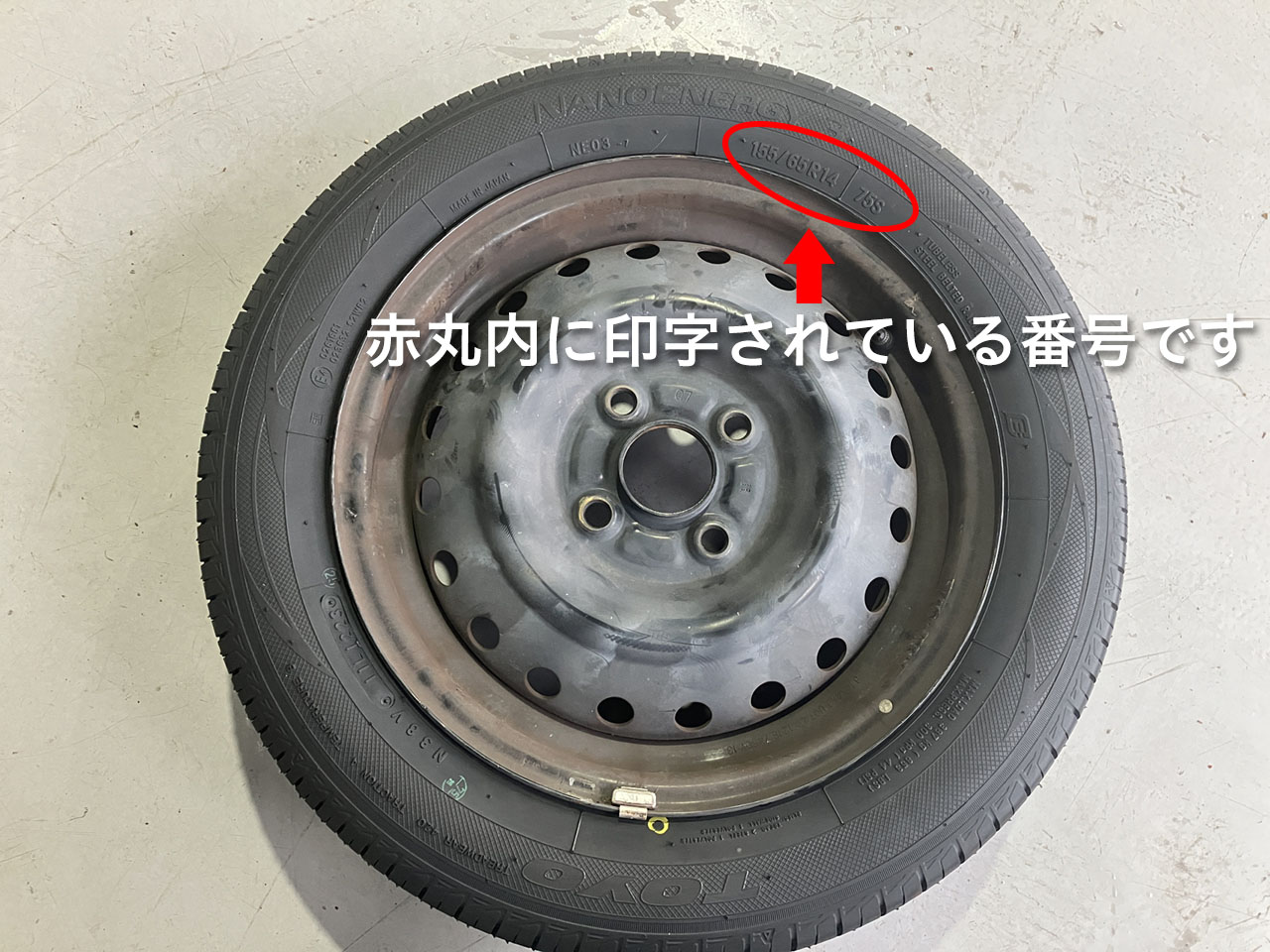 写真の場合(155 / 65 R 14 の場合)読み方は、155の65R(アール)14となります。表示内容の意味は下記のようになります。※タイヤの寸法は、サイズ表示毎にタイヤの製品規格によって定められている範囲の寸法になります。
