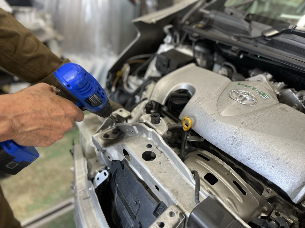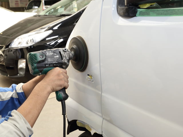 破損部分の鉄板を引っ張ったり圧したり叩き出したりと、元の状態に近づけます。 凸凹を埋めて平らにし、形を修復していきます。